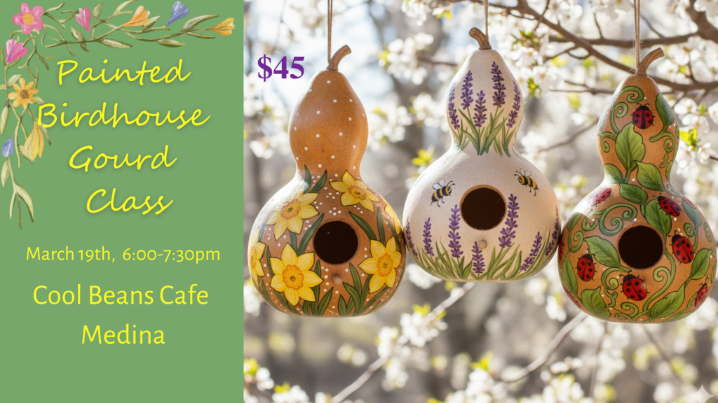 Birdhouse Gourd Class, Thursday, March 19th, 6-7:30 PM, Cool Beans Cafe, 103 W. Liberty St., Medina, OH 44256