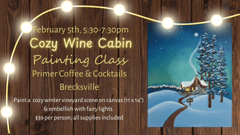 Cozy Wine Cabin Paint & Sip, Thursday, February 5th, 6-8:30 PM, Primer Coffee & Cocktails, 9000 Canvas Parkway, Brecksville, OH 44141